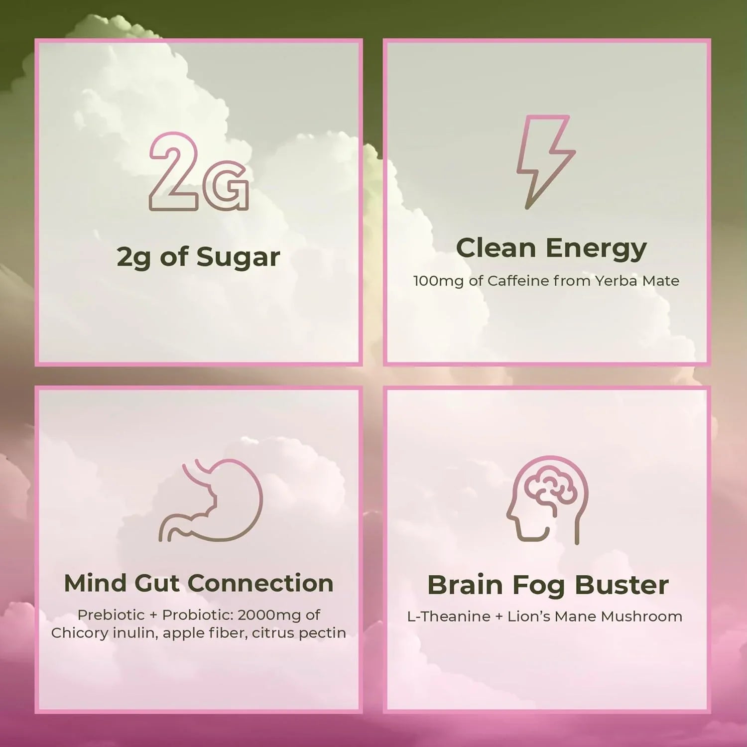 - YERBA MATE BOOSTED 3-in-1: Discover the clean energy of yerba mate and matcha tea leaf with the power of prebiotics and probiotics PLUS nootropics.