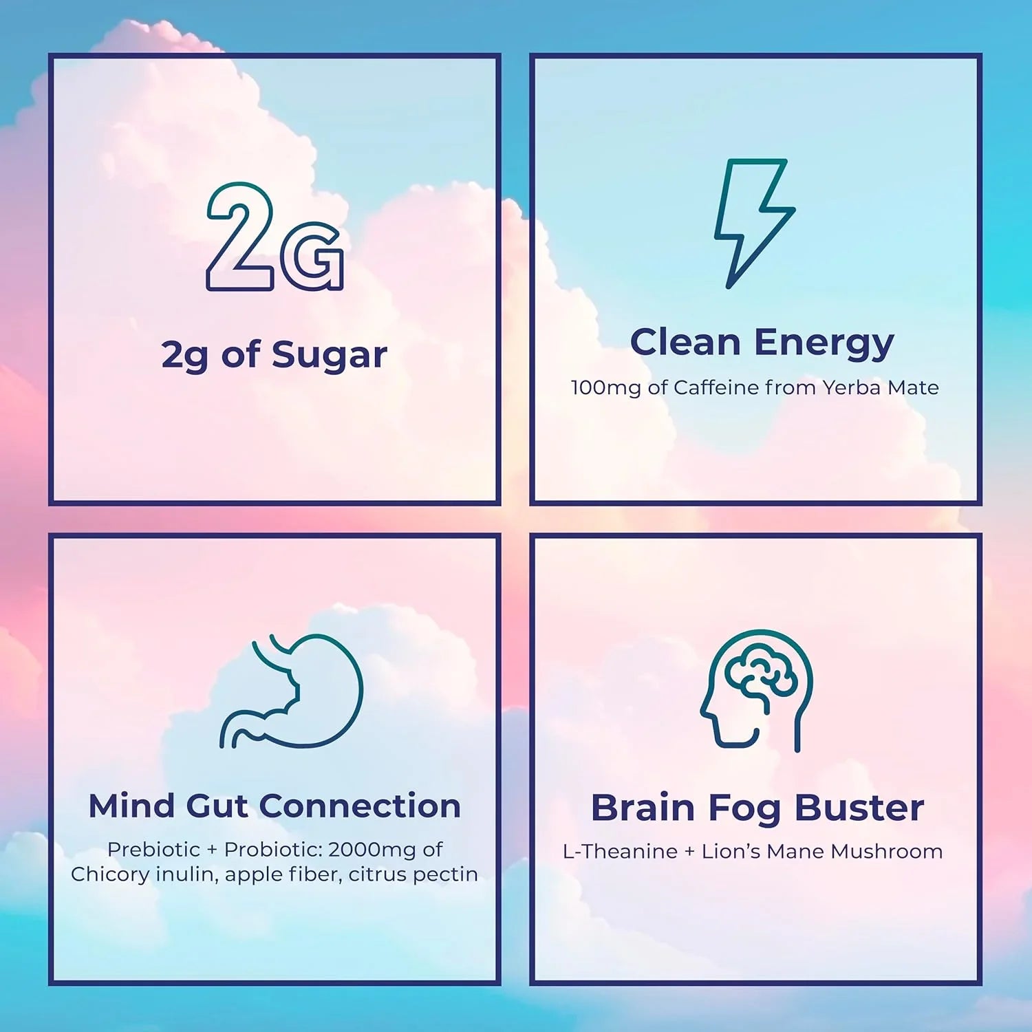Each serving contains 100mg of natural caffeine from Yerba Mate, providing a steady energy boost without the jitters or crashes of coffee.